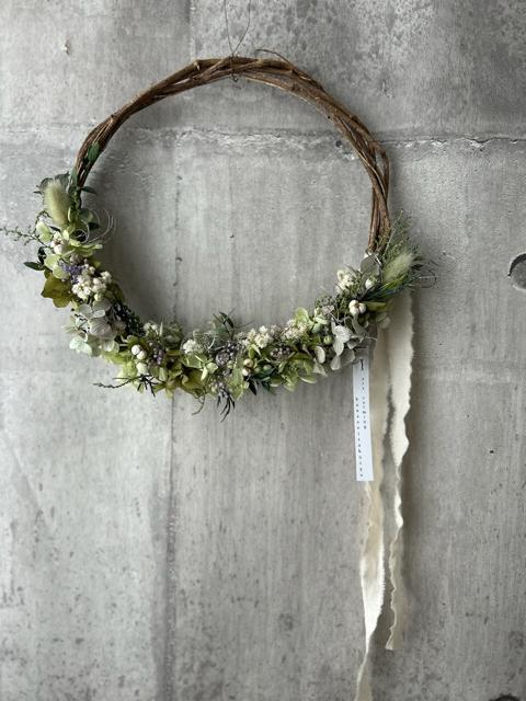 サイズ約26×29㎝長くお楽しみ頂けるプリザーブドフラワーで仕上げました。色んなグリーンの中に優しい草花を合わせました。時間経過によりいずれはゆっくりと退色していきますが、飾る場所によって色もちは異なります。なるべく光や日差しが当たらない涼しい屋内の場所ですと、いい状態を保ちやすいです。お花が過ごしやすい場所に飾ってあげるのもいいのですが、お客様が1番飾りたい場所で飾っていただくのもいいかもしれません。