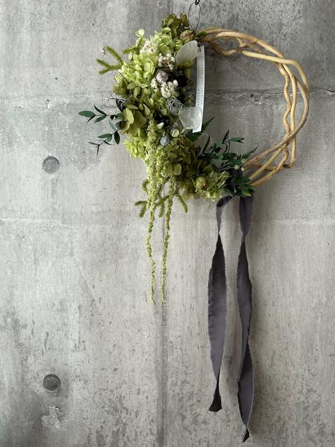 サイズ約25㎝長くお楽しみ頂けるプリザーブドフラワーで仕上げました。個性ある形でも優しい雰囲気にまとめました。時間経過によりいずれはゆっくりと退色していきますが、飾る場所によって色もちは異なります。なるべく光や日差しが当たらない涼しい屋内の場所ですと、いい状態を保ちやすいです。お花が過ごしやすい場所に飾ってあげるのもいいのですが、お客様が1番飾りたい場所で飾っていただくのもいいかもしれません。
