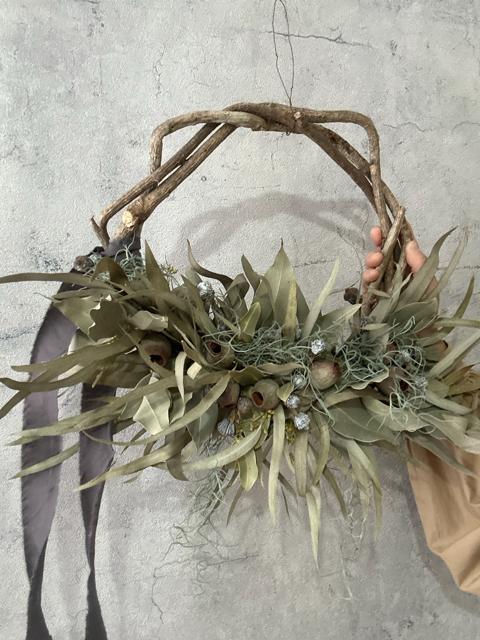 サイズ約38×46㎝シンプルなユーカリのリース。長くお楽しみ頂けるプリザーブドフラワーで仕上げました。時間経過によりいずれはゆっくりと退色していきますが、飾る場所によって色もちは異なります。なるべく光や日差しが当たらない涼しい屋内の場所ですと、いい状態を保ちやすいです。お花が過ごしやすい場所に飾ってあげるのもいいのですが、お客様が1番飾りたい場所で飾っていただくのもいいかもしれません。