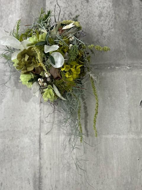 サイズ約20×17㎝色々な緑を楽しむためのプリザーブドフラワーのリースです。色んな日々の中でグリーンを目に留めて少し深呼吸してまたゆっくり進んでいただけるような癒されていただきたい気持ちで作っています。たくさんの植物を集めて形にしたら生命が宿ったような動きが作れました。グリーン系が目に優しいです。ドライならではのナチュラル感をお楽しみください。適した環境は涼しめの光が当たりにくい暗い場所が1番いい状態を長く保ちます。次に日陰です。